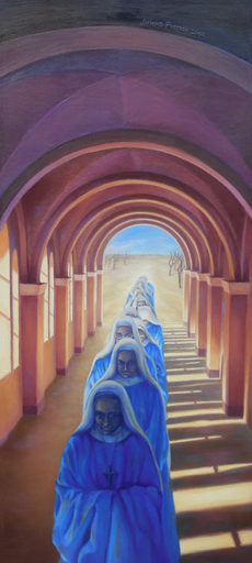 Voorbij de zichtbare figuratie van ’De Laatste Gang’ gaat een intieme wereld schuil die langzaam aan het uitsterven is, en steeds verder vervaagt naar de ijlere lagen der werkelijkheid. De kleuren van het sacrale Gregoriaans gezang laten oude herinneringen weerklinken terwijl de monniken en nonnen hun laatste gang maken. Naar binnen.