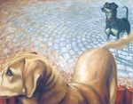 2006Bij dit olieverfschilderij gebruik ik de dingen die in en rond ons huis gebeuren. Honden die hun territorium bewaken. Te koop.