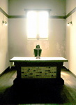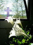2007Foto van een kruis met witte lelies in het kerkje in de levenstuinen van het Groot Hontschoten; Teugen